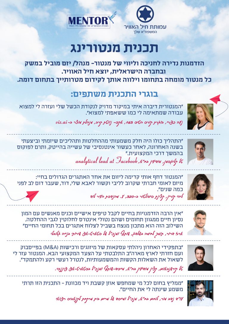 כל מנטור בתכנית הינו מנהיג, בעל מומחיות וניסיון בתחומים שונים, אשר מתנדב לחנוך, להדריך, וללוות בוגר חיל האויר “צעיר ומבטיח” בדרך לקידום מטרותיו.